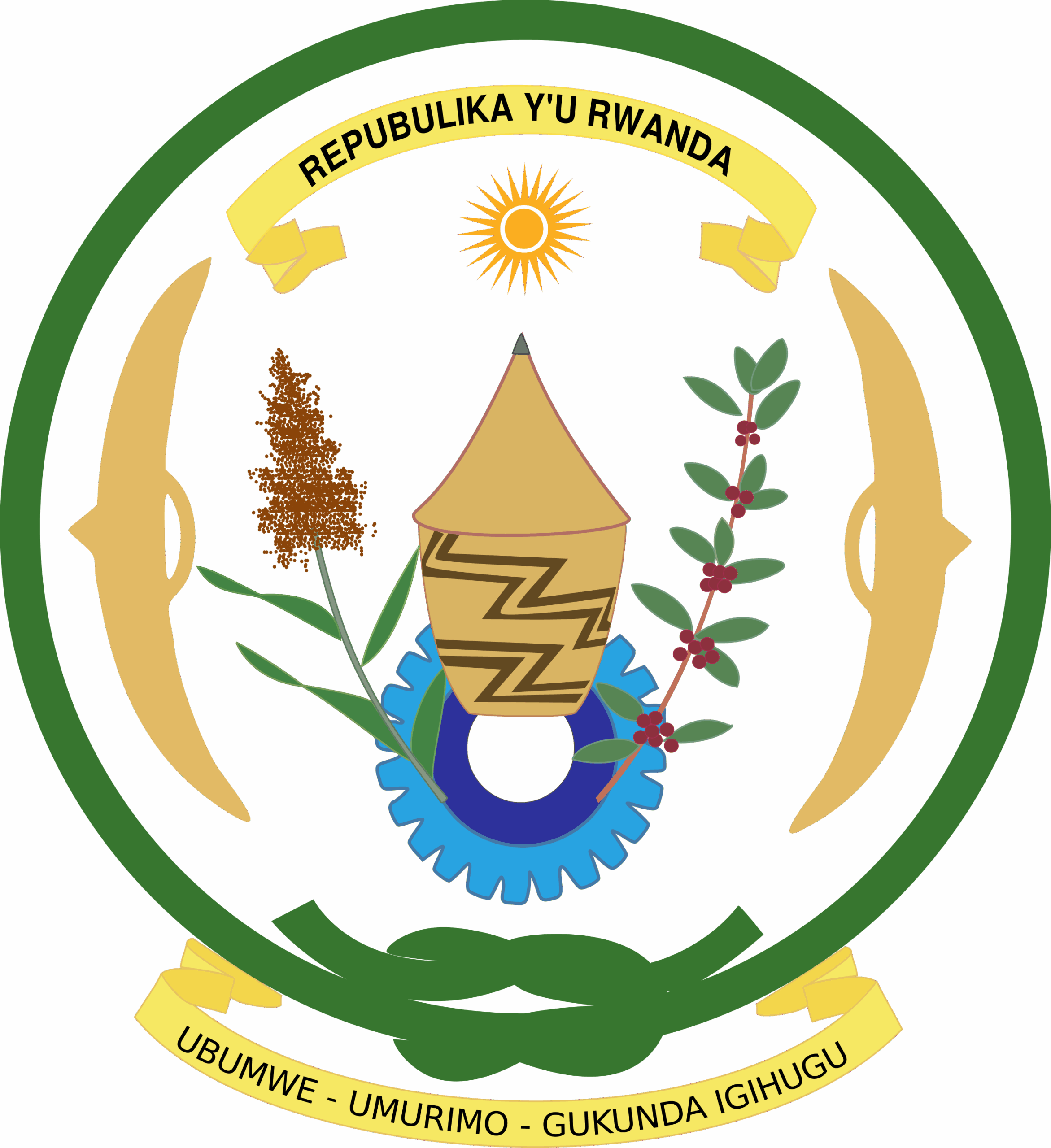 • Een banner met de tekst “Republika y’u Rwanda”, de officiële naam van het land.